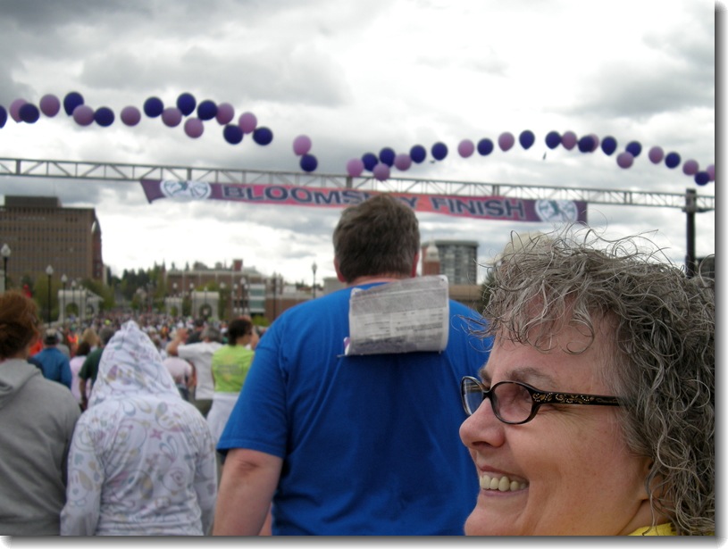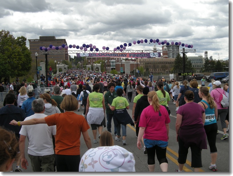 The balloons across the finish line are all being pushed up by the stiff breeze running along the Spokane River. It suddenly felt cold, and when we slowed down after the finish, it felt colder still. Would it rain? It really felt like it was going to cut loose!