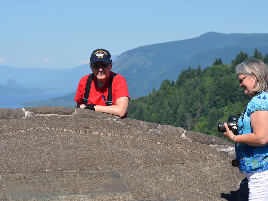 I snapped this shot over Joan’s head, as she took a photo of the Gorge and Crown Point off to the right. We would be visiting that building a bit later on. We are looking upriver on the Columbia River. Interstate 84, which was named Interstate 80 North, back in 1974 when I first met Dotti, is running along beside the river.