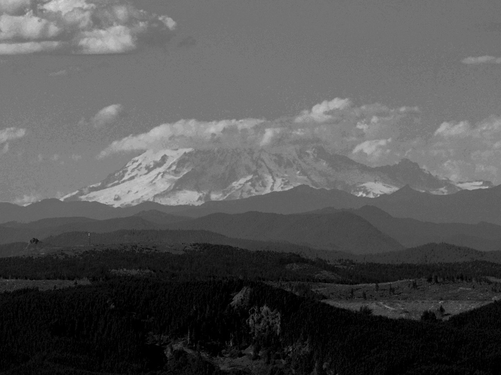 Using a zoom, we could bring Mt. Rainier closer, but it destroyed the color of the scene, so I converted the image to black and white so you could see the shape of the mountain, and its snow and cloud covering.