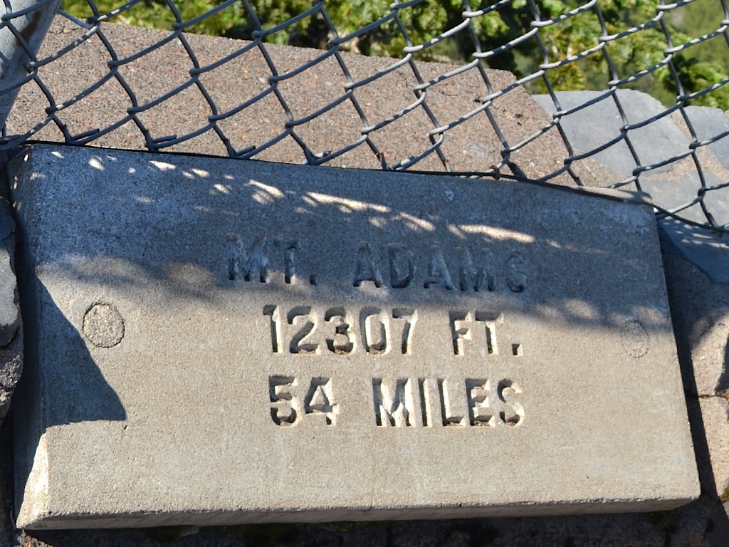 Over in the far left corner of the platform, was the plaque for Mt. Adams, the 12,307-foot volcano, which, even though it is only 54 miles away, is not easy to get to. It doesn’t have the road system access and trails commonly hiked that the other tall volcanos do. So, even though it is taller than Mt. Hood, it is isolated and not a point of visitation by all that many each year.