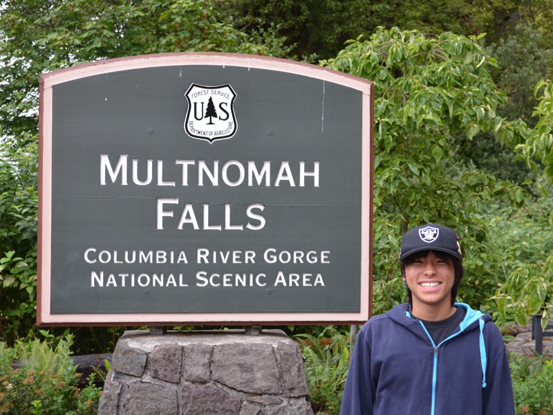 It was 8:10am when I snapped this picture of Kai by the Multnomah Falls sign, right beside the Multnomah Falls Lodge. We arrived early, coming in on the "Historic Columbia River Highway Scenic Byway," and got a great parking spot very close to where this sign is located.