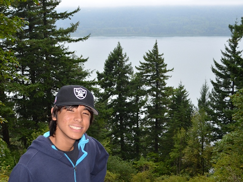 | And 10 minutes further up the trail we stopped to get a picture of Kai with the Columbia River behind him, and the misty mountains in Washington state beyond that. You can see that we are looking down on the tops of some pretty good sized pine trees. The trail was moving up sharply. | ![]() | ||||