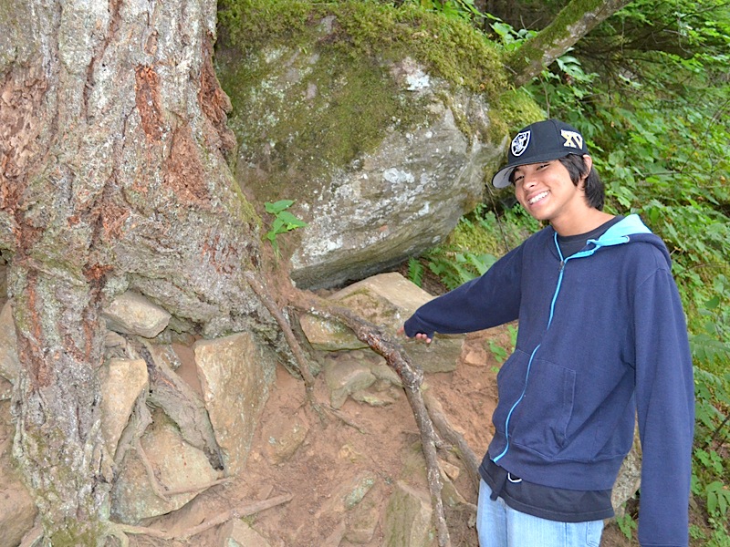 ![]() | Life is incredibly adaptive. Kai is pointing to the root system of this massive tree, working is way into the basalt and soil of the rocky roots of Larch Mountain, pushing back against a fallen boulder, while grabbing its own footing by reaching around, and over broken rocks beneath it. | ||||