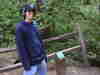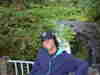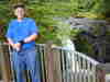 | Here is Kai, standing on Benson Bridge, while behind is the drop pool for the upper falls. This point is at elevation 120 feet, or up 100 feet from where we started. If you look closely, you can tell that the quantity of water actually flowing over the falls, and draining away below the bridge is quite small at this time of year. | ![]() | ||||