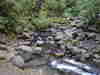 | Upstream just a bit, and the water is clear on the left, and on the right it is going back and forth into white and clear. The branch out over the water is covered in moss, as are some of the stones in the water. (Note they are well rounded, and that means they have been here a while.) | ![]() | ||||