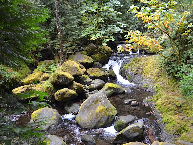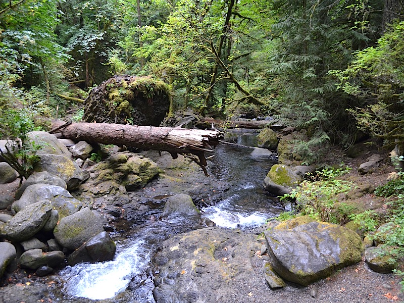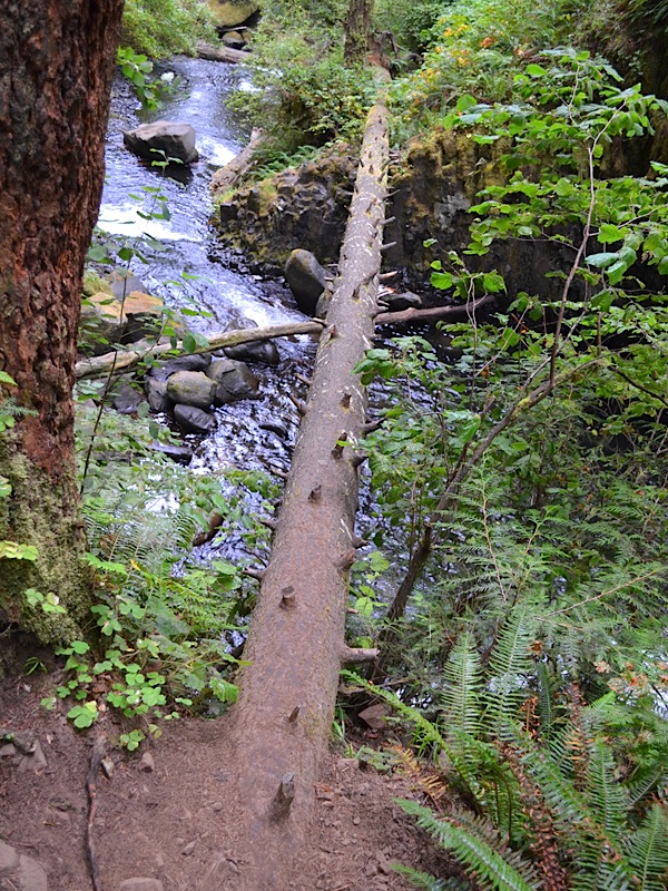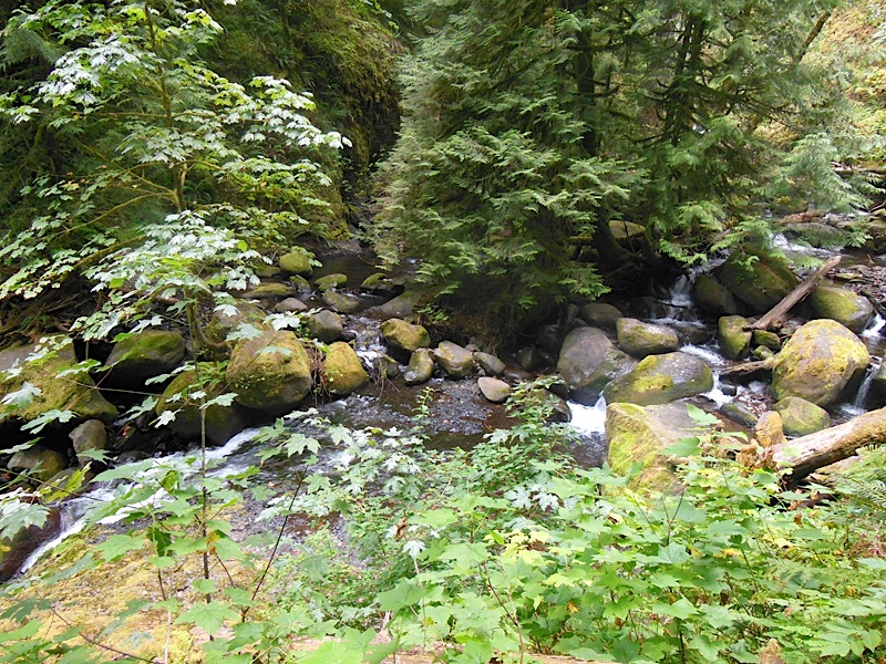 If you follow this trail all the way to the top of Larch Mountain there is one point along the trail where things narrow down so much that they created two separate paths, one for low water, like now, and one for high water, where the secondary path goes up and over past a channel narrows that gives no room for the lower trail to avoid being flooded.