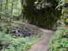 | The gently flowing stream tells one story, while the debris lying in its path tells another. Today the creek is quietly running along, with just enough water to create clear pools, small delightful waterfalls, and a happy little bit of pleasant babbling to cheer the happy hikers along their way. The large rounded boulders, the fallen trees, aligned with the flow of the stream, and the creek bed that is much wider than the stream is on this day, all speak of a far more violent mood that Multnomah Creek is capable of. | ![]() | ||||