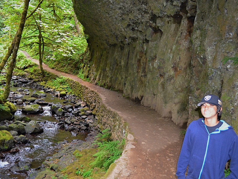| Just up the trail a few steps is a view of the upper falls. We still have a ways to go, but, as you can see behind Kai, we are about even with the point where the rock fell out of the face of the wall behind the falls, and it fell 225 feet. Since the upper falls is 544 feet we are well above the level of Benson Bridge now. | ![]() | ||||