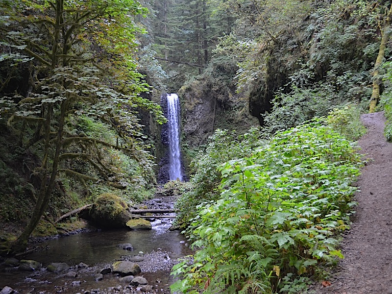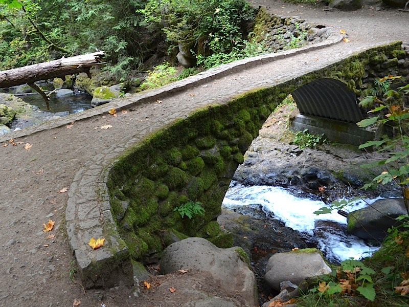 Turning to look back, there is the spot Kai had been standing only moments before at the uphill side of the bridge, with the downstream path of Multnomah Creek beyond.