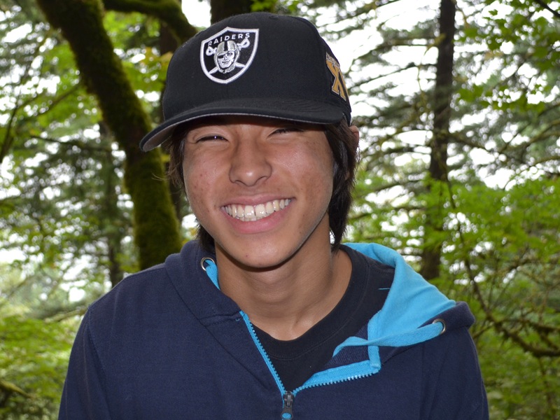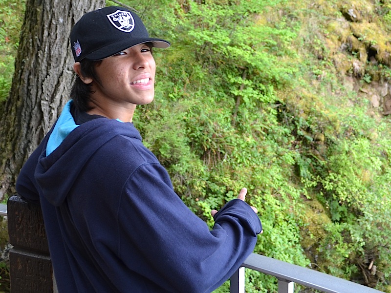 It had been about 20 minutes since I took the picture of Kai in front of the sign by the parking lot. We were at the first major landmark after Benson Bridge over the lower falls. There is a bench here for resting and a great view which stretches out behind Kai's radiant smile. He is a handsome lad, who, as you can tell from his hat, loves the Oakland Raiders, just like his dad. | ![]() | ||||