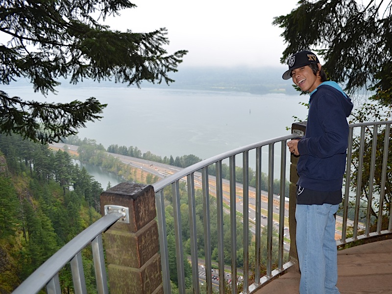Kai has crossed the upper Multnomah Falls bridge while I stopped to take the previous two pictures. He is still smiling so he is doing well after the climb to the top, and ready to push on! | ||||