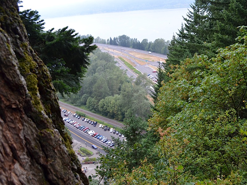 Looking down from the top, you can see the lower viewing platform at the bottom, the glass in the roof of the lodge through which restaurant patrons can view the falls, the Columbia Scenic Highway and its parking lot—if you look closely, you will see a white hashed crosswalk cutting the Scenic Highway, and on this end of that crosswalk, just to the right of it, there stands the Multnomah Falls sign where I took Kai's picture, and where we began this hike—Interstate 84 and its parking lot, a bit of Benson Lake, and the Columbia River. The water that began 4000 feet above the Columbia River, flowing down Multnomah Creek, will pass through the lake and then into the Columbia, before making its way to the ocean, and remember the sea level‐NOT the river level, but SEA LEVEL— is only about 20 feet below those parking lots!