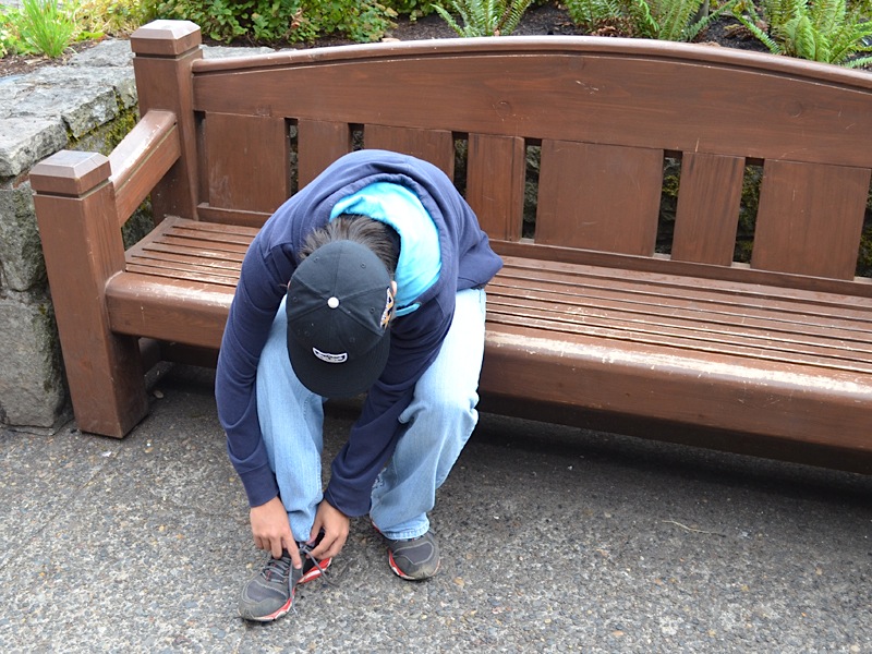 And here we are. The hike is over. Here is Kai on that bench I mentioned earlier and tying his shoes. I was plenty tired and ready for a relaxing drive back home. | ||||