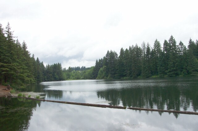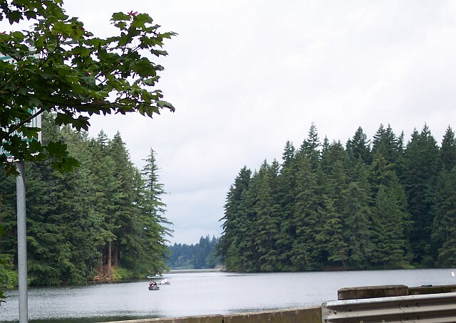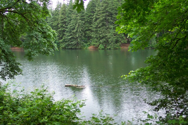 Looking west from the parking lot we can see Lacamas Lake, which was created by two dams in Lacamas Creek. The lake is drained through Round Lake, and then back into the Lacamas Creek, which in turns flows into the Washougal River. The lake is fairly large, covering 315 acres, with an average depth of 24 feet, and at one point it is 65 feet deep. Its shoreline extends for 5.3 miles. As you can see from the picture it is used for boating and fishing. I found it interesting that the city of Camas -- orginally also called Lacamas, but the name was later shortened -- was founded by Henry Pittock (builder of the Pittock Mansion) in 1883, to help with his building and running a paper mill. This was important to Pittock, because he owned the Oregonian newspaper, and paper was critical to his business. |