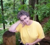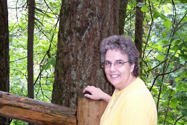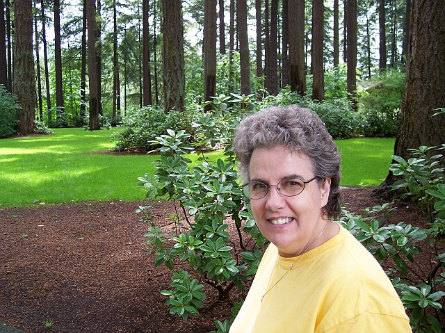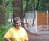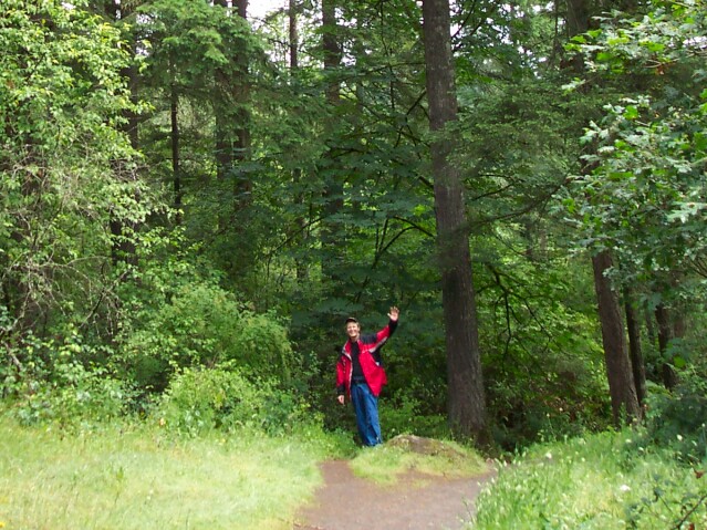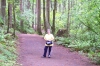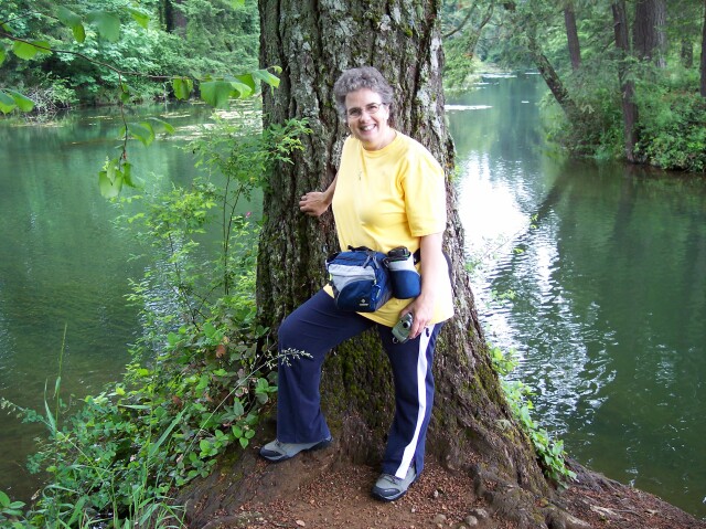 Dotti has her camera in hand, and showing a big smile. The trees are not terribly thick here, but the sky was overcast, and that was still keeping the temperature down. |