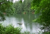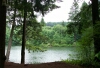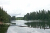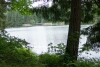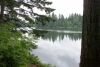 As we move up to the north, towards the shore's bend to the west, Round Lake grows narrow. The gray sky and the beautiful green trees are reflected in the water. |