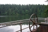 This picture was taken on top of the dam itself. The wheel is part of the dam control machinery, and Round Lake sits in tranquility beyond. |