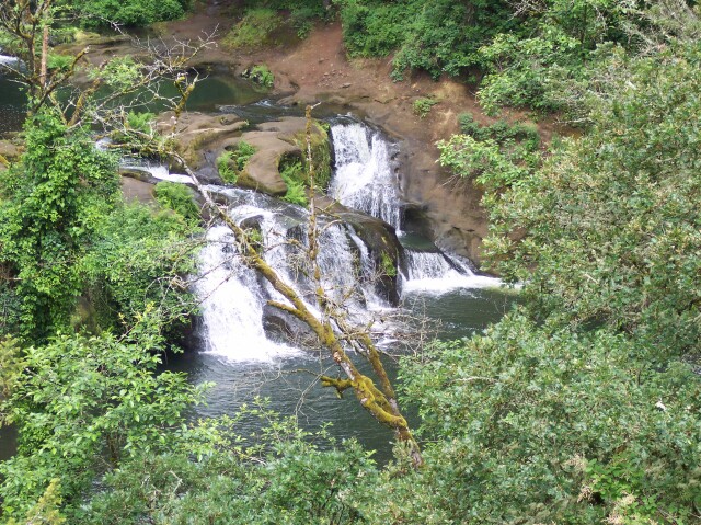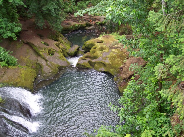 "The Potholes" is a short 20-foot waterfall below two rounded out depressions in the rock. Floodwaters sometime in the past twirled stones in place, carving out the depressions. |