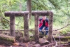 My lovely Dotti crossing a wooden footbridge spanning a small creek. Notice the wooden cross members laid on the path behind her? Those will keep rain water from cutting a channel down the middle of the path on that hill. The water is instead directed off to the side of the path. |