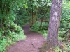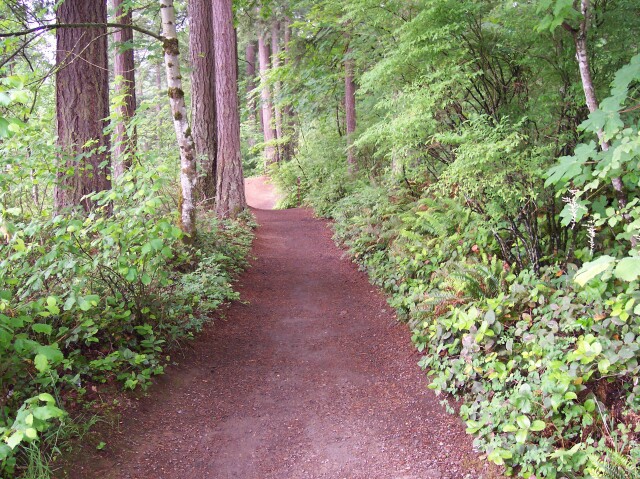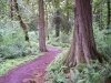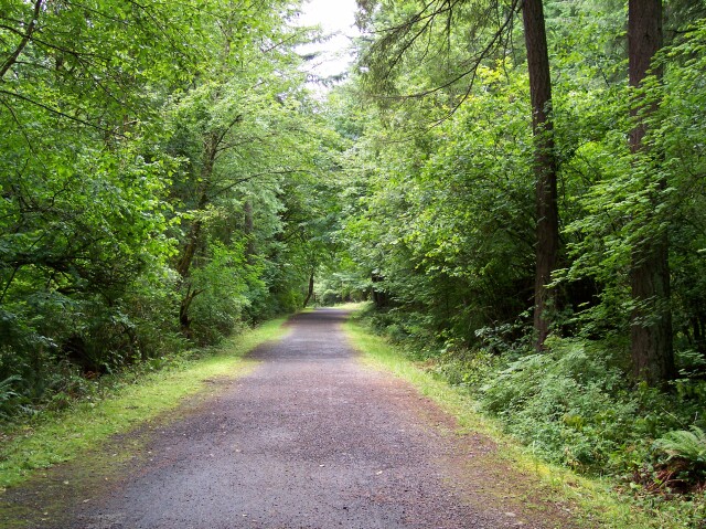 On our westward course the path was actually a service road, but it was still flanked by beautiful green trees and underbrush. |