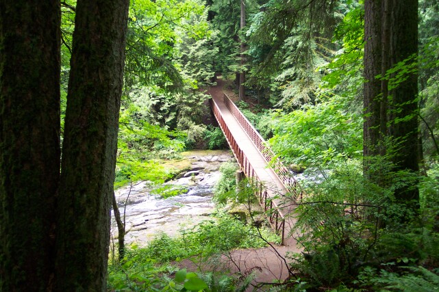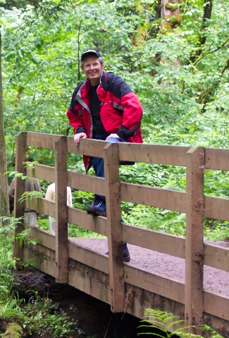 ![]() | My Dotti is on the bridge now, as we had exchanged places. Woodburn Creek is small, compared with Lacamas Creek, but it is surrounded with beautiful greenery. | |