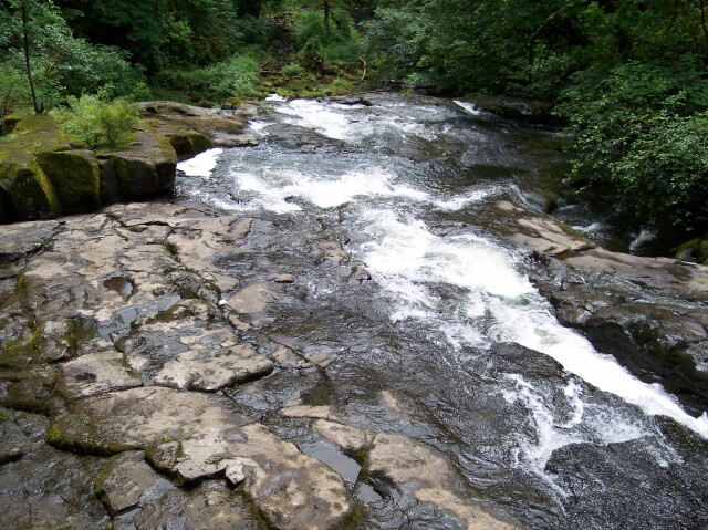 The downstream view from the dam. Notice the interesting gouges that have been cut into the stone by flowing water in the past. It is a smaller version of what "The Potholes" look like, as we were soon to see. |
