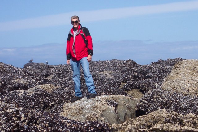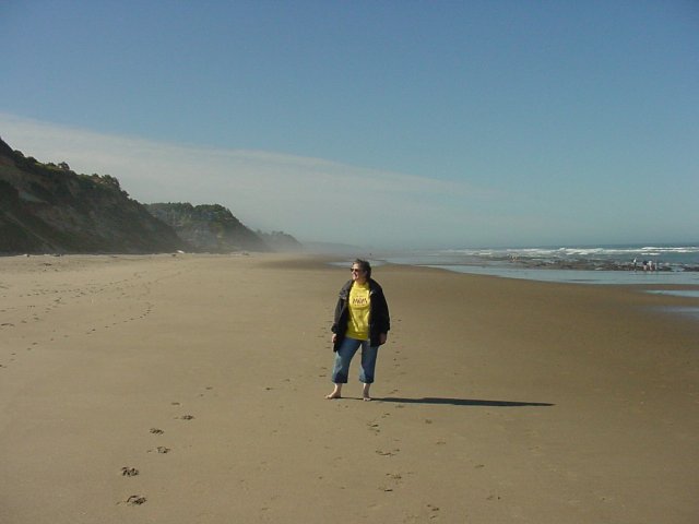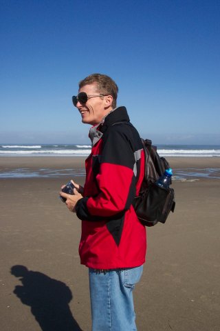 Dotti took this picture of me as we were getting set to start out on our hike. Notice that the sun is shining brightly. We had mostly sunshine nearly the whole time we were at Lincoln City. (Well, okay at night it got dark. ) In spite of the bright sunlight, it was still nice and cool. We kept our coats on for nearly the entire beach portion of our walk. It never got really hot during our visit, and we were able to enjoy a fire in the fireplace each night!