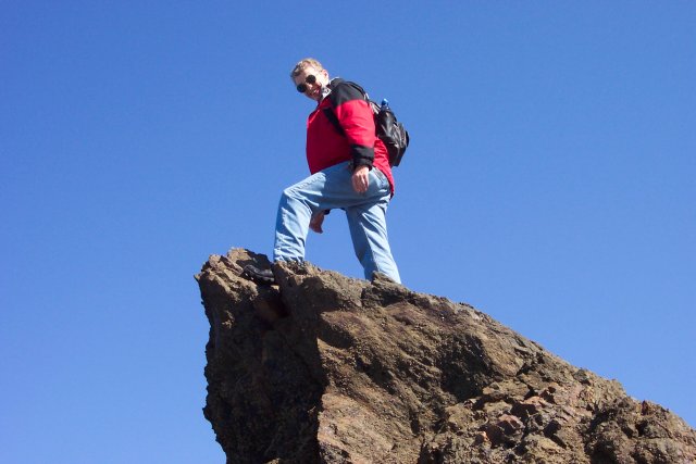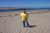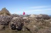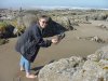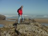 Here I am doing a little "mountain" climbing. At the foot of the "mountain" you can see a temporary lake stands behind me, and a temporary river flows back around the rock standing alone just this side of the breakers.