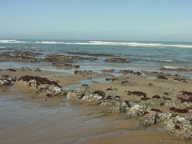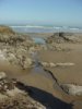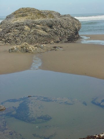 The rocks here are covered with barnacles, and surrounded by sea plants. Water is cutting its way through the sand heading down to the ocean, where it will later be lifted up once again to cover this area of the beach.