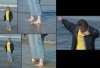 There are 5 pictures in this collage. The first one shows the look that Dotti had on her face when she stepped into the water for the first time. Can you say, "Cold!"? Moving to the right you see her feet in the water which doesn't reach her ankles. Moving downward and to the left, you can that the cold water is getting her attention. To the right of that you can see that her right ankle is covered and the left one is only half exposed to air. You can also see that behind her there is a wave sneaking up on her. Moving all the way over to the right you can see Dotti scrambling to get clear of the wave, but she didn't make it. Her pants got wet for a few inches up from the cuff.