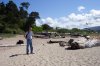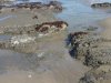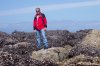 We have made it over to the rocks mentioned above, and are walking on ground that will be underwater by the time we made it back at the end of our walk. Dotti has decided that she is not going to wear her sandals on the sand. So, she is cleaning them off, readying them for stowage in the backpack, by slamming them against the barnacle incrusted rock, and she appears to be enjoying the process. Off in the distance you can see that the rocks extend quite a ways towards the west, and are dry at this point in time.