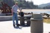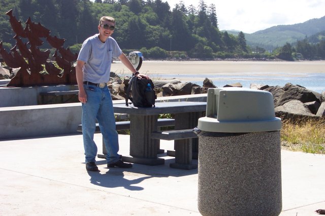 Here I am getting things organized in my backpack. At this point I could already tell that my boots would be giving me trouble on the hard walking surface. On the beach it hadn't been too bad, because the sand gave some cushion to each step. But now my heal was going to get the full brunt of the hardness of the boot. (For future hikes with these boots, I will need to get a nice soft insert.) Our coats are safely put away in the backpack, and all is ready to head back. There is a sculpture of a school of fish behind me in this picnic area.