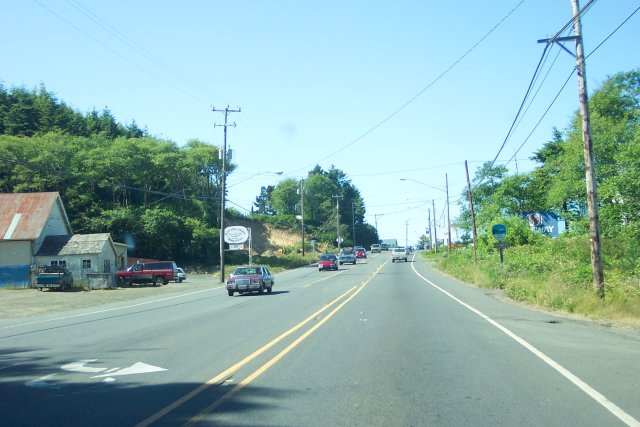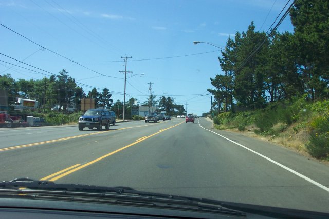 We finally saw some downhill terrain. Unfortunately, we lost the sidewalk, just before we reached the Inn At Spanish Head, and for the next mile or two we were forced to walk in the bicycle lane that you can see painted along the edge of the highway.