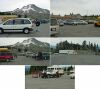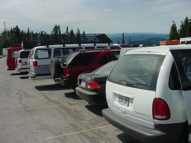 | Here are a few shots of the van, and the parking lot. In the first one, Dotti is waiting patiently, with the mountain peak behind her. Moving clockwise you can see the Timberline Lodge, in the background with the day lodge in between. Notice the empty parking places. Continuing clockwise, you can see the south end of the parking lot is completely empty. In the bottom shot, you can see the search and rescue people getting all decked out around their vehicle. Continuing clockwise, you once again can see Mt. Hood's peak. |
