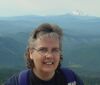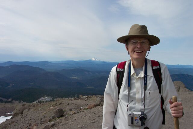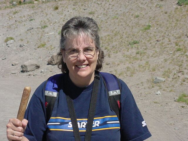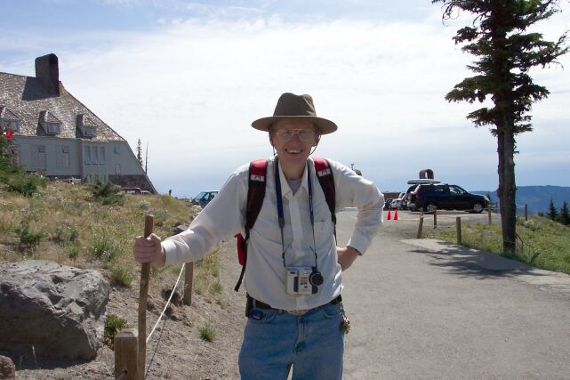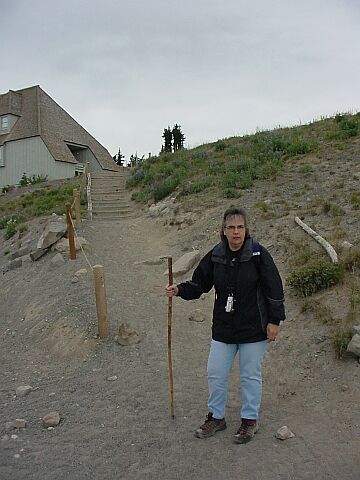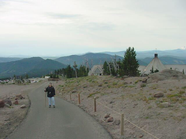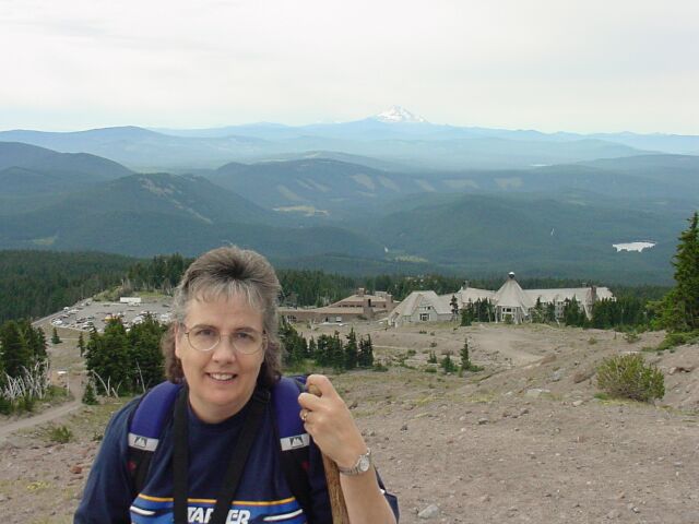 | With Mt. Jefferson off to the extreme right, and the lodge just peaking over the top of the hill on the right, here is Dotti smiling. Our car is parked in the parking lot well behind her. |