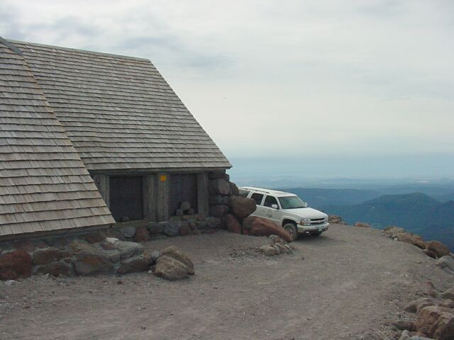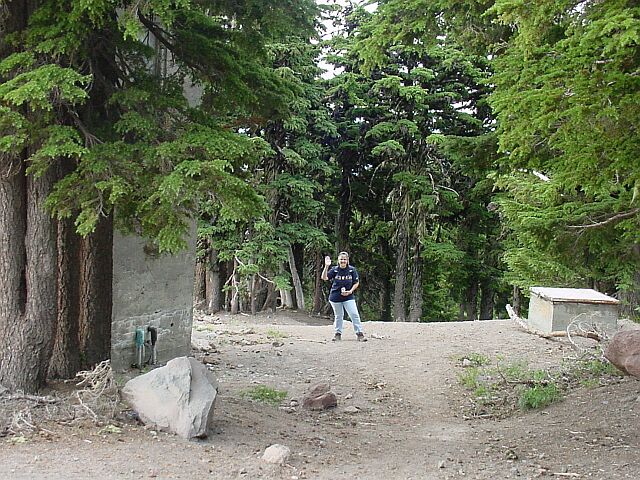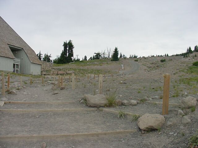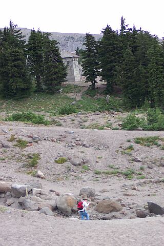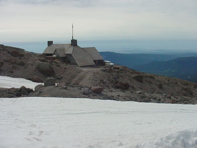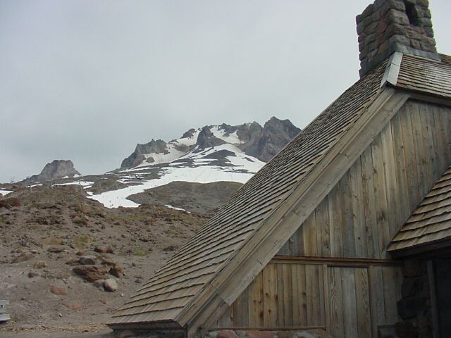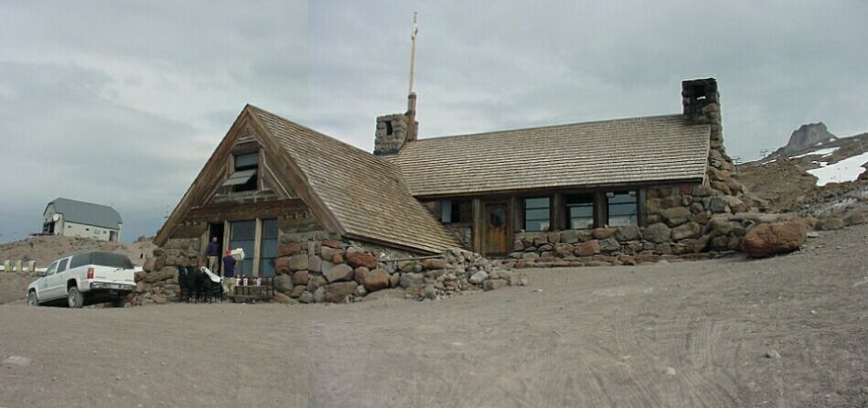 We (gasp gasp) have (gasp gasp) arrived! (gasp gasp) Yes!!! (gasp gasp) I put two pictures together to make this one picture of the entire Silcox Hut. We are now at 7,000 feet and wishing we had some oxygen bottles in our backpacks. But we made it! Off to the left you can see the chairlifts and we will be heading that way next. We saw some guys from the lodge moving boxes around, and we heard one of them complaining to the other about the guy who had just driven the other truck down the mountain for a second time. "He always volunteers to drive so he doesn't have to work." It seems that life is the same all over, even at 7,000 feet. |