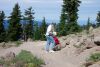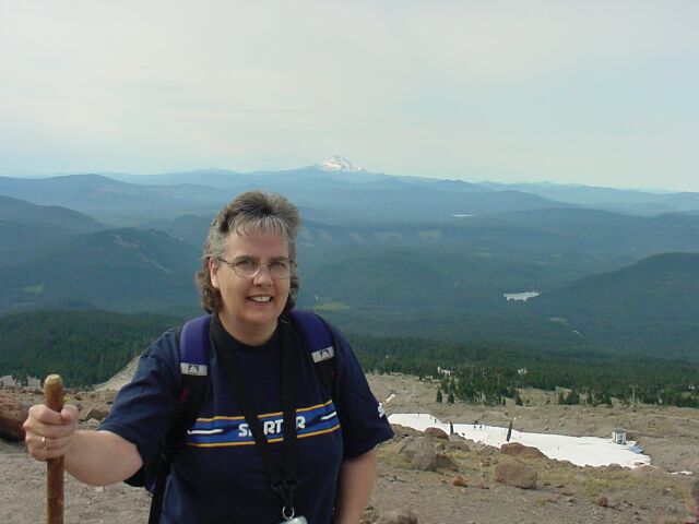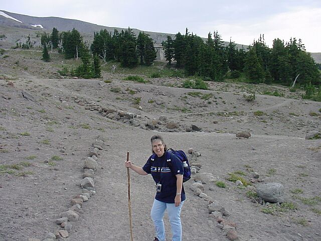 | We have come up a ways from where the last picture was taken. You can see the white trees behind Dotti on the left. To the right is the top of the Timberline Lodge, and off in the distance is the ever-present Mt. Jefferson. |
