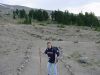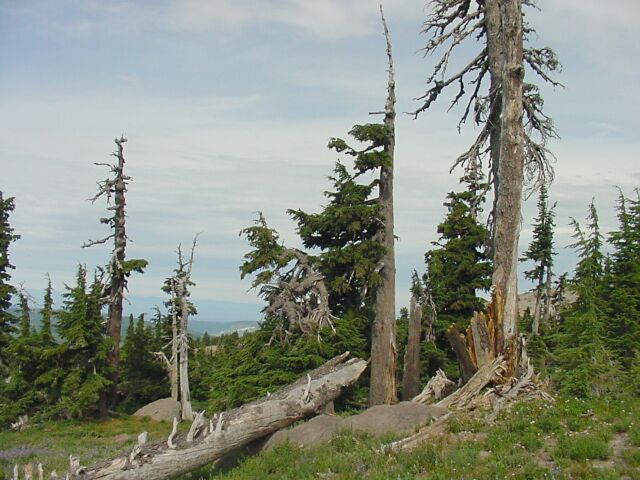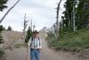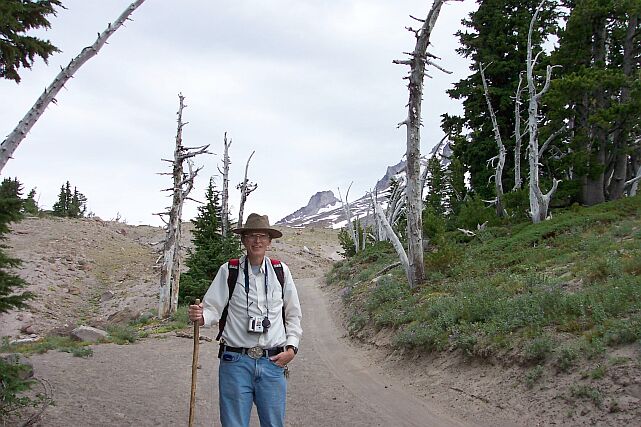 | Here I am standing on the service road/Mountaineer Trail joint path. The dead trees standing behind me mark the edge of the timberline. The average temperature from here on up is just too cold for the trees to sustain life. The water freezes for too many of the days per year and they cannot move enough of it to live. The strings of white dead trees look like ghosts stretching off in lines that run all the way around the mountain. | |||||||||||||||||