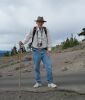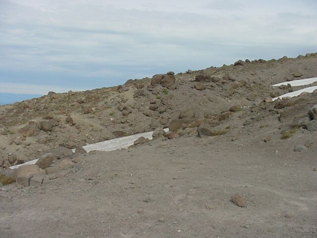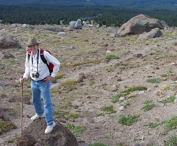 (Dotti performed a little science experiment on the way up to Timberline, inadvertently. She had a bottle of tap water in the car that she had sealed before we left home. When we got up close to the Lodge, she opened the bottle and some water spit out the top and up into the air, because of the pressure difference of what was inside the bottle [14.7 psi] and what was outside [11.8 psi].) The thin air made it difficult to breathe and the hiking was much tougher as a result. We had to take several rest breaks on our hike to the Silcox Hut at 7,000 feet. It was tougher than Larch Mountain had been in the sense that even just putting one foot before the other and trudging slowly was not enough for us to be able to continue on. We still had to stop and let our hearts slow down, and our lungs catch up. Most of our hike this week, like last week, was walking across bare ash, and other volcanic deposits. We spent about half of our hiking distance, and more of our hiking time, looking up at the crater and lava dome of this temporarily dormant volcano. (Though it was perfectly quiet while we were there, it does vent steam periodically, and there are seismic disturbances quite often under the mountain, to remind us that magma is still moving around down there, and that it is not yet dead.) Just below the crater were a great number of people, looking like ants on the hill, skiing on the snow that still clings to the upper slopes of Mt. Hood. The last eruption, which was not as explosive as what Mound St. Helens has been up to, poured lava and ash down its south side, creating a very nice slope for skiing. After we reached the top, we followed the less used trail, which was a bit harder to track but it provided some interesting scenery on our trip down. We finally descended below the timberline and finished our hike walking through the forest for about three-quarters of a mile back to the Timberline Lodge. |