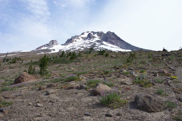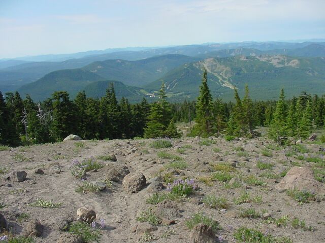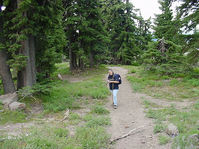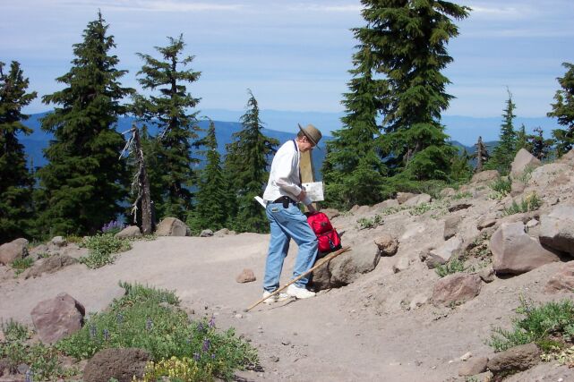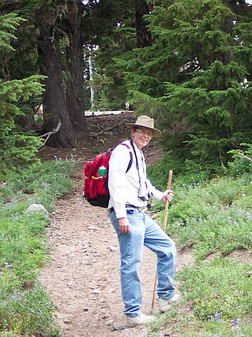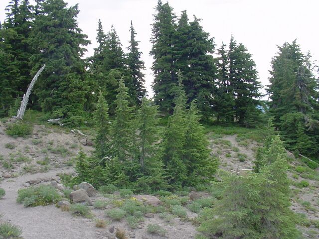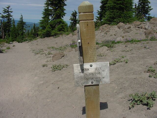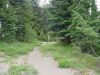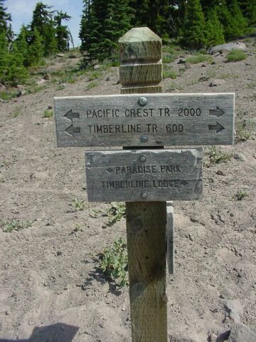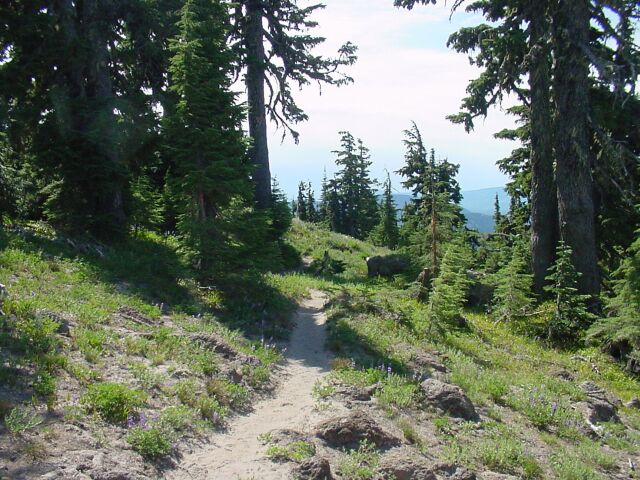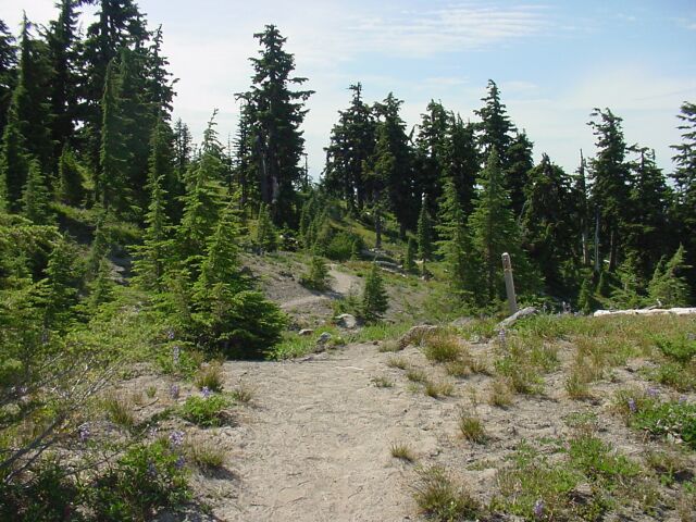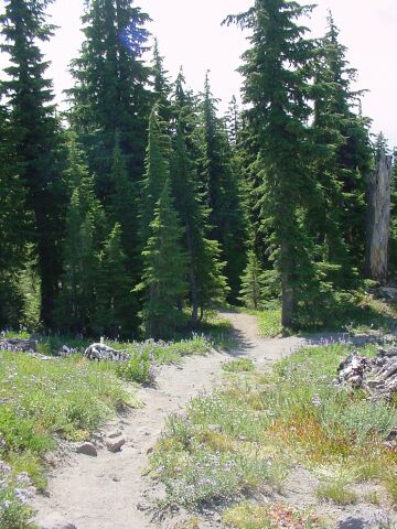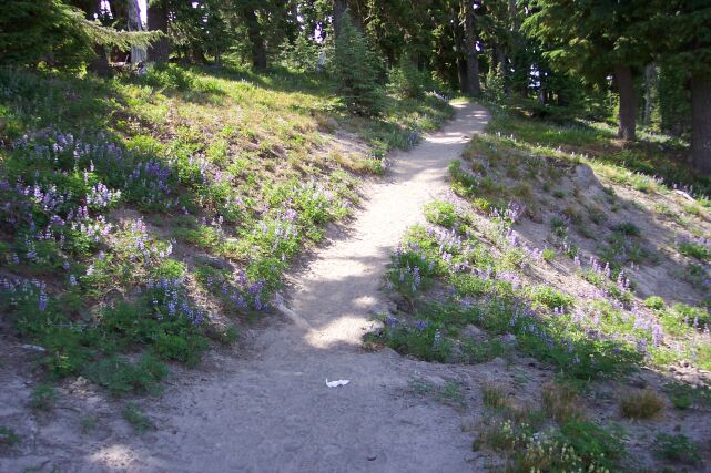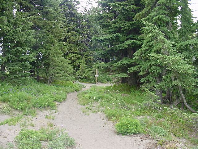 | The other trail is the Pacific Crest Trail once again. Originally I had planned to take that trail out a couple of miles to view the Zigzag Canyon. But by the time we reached this point our legs were very tired and we had had enough high altitude climbing for one week. We could have followed the Pacific Crest Trail back to the right, (the path with the flowers above) and it would have taken us right to the same spot where we had joined it at the start of our hike, behind the lodge. But we decided to take the Mountaineer Trail down through the forest to the front of the lodge instead. |