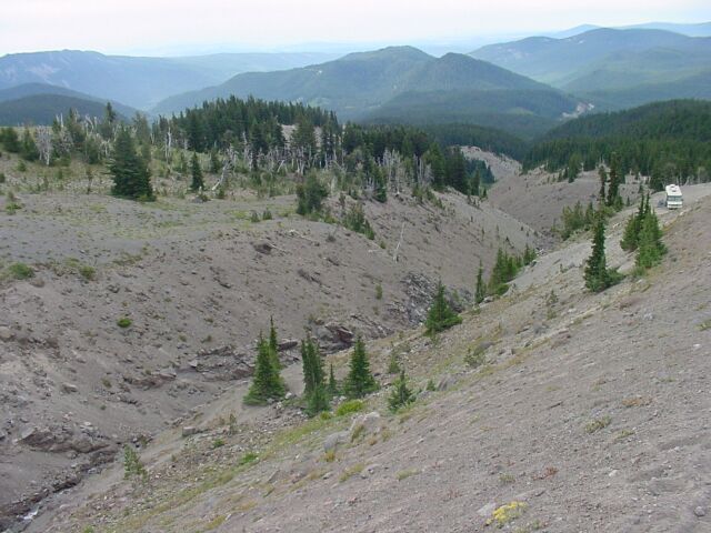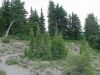 | We are working our way back and forth through the timberline at this time. The trail cuts through this stand of trees here, but it will only be a brief, but enjoyable respite from the ash-covered lands. | |||||||||||||||||