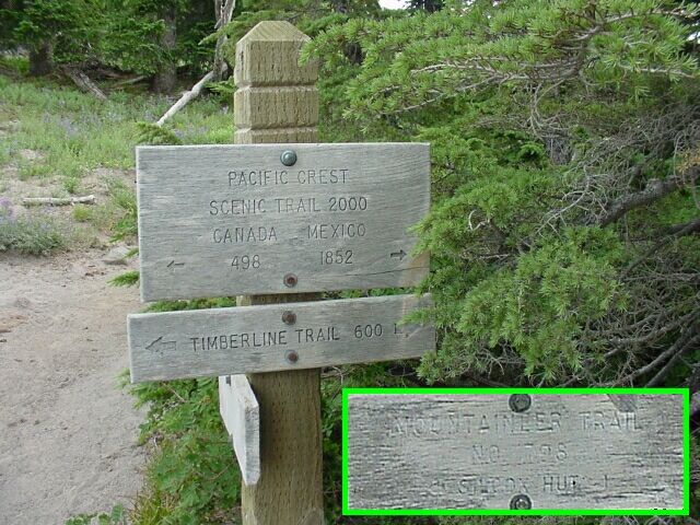 | The sign points to the right, the way back up the mountain to where we just came from, and to the left where the Mountaineer Trail continues on to the Timberline Lodge. |