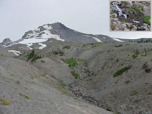 | As the snow above is hit with sunshine, it naturally begins to melt. The water runs down the mountain in streams like this one. Inset is a close up of the little waterfall that is actually located in the center of the picture. We feel that no CFHC hike is complete without a stream and waterfall. |