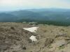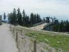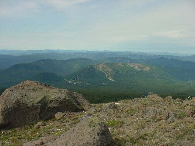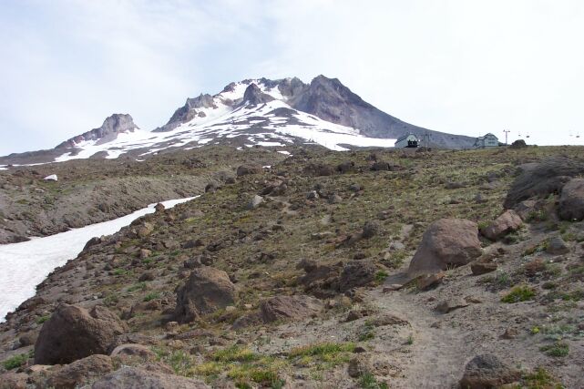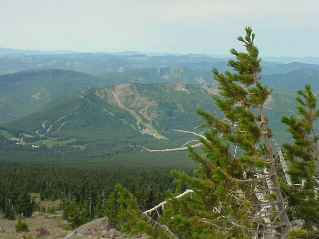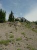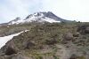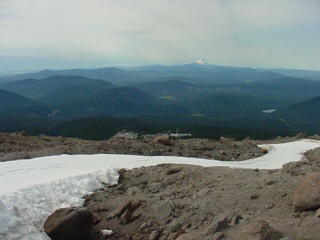 | Looking back along the trail, past the Timberline Lodge, over the day lodge and at Mt. Jefferson in the distance. |