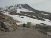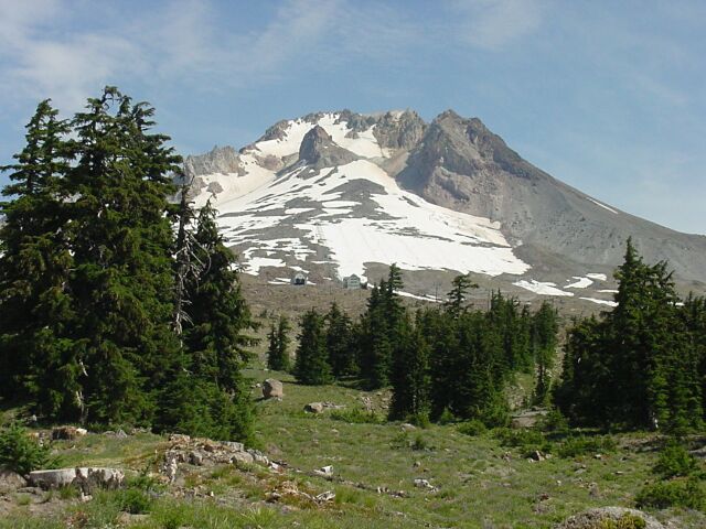 | Now we have cleared the two snow hazards and are safely on the other side, looking back at the Silcox Hut. | |||||||||||||||||