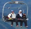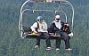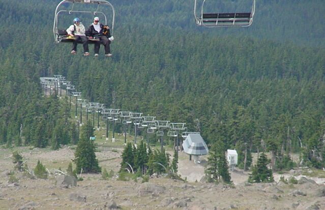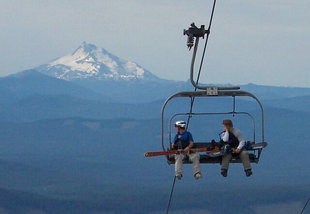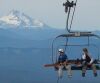 | Mt. Jefferson looks like it is nearly in the chairlift with these skiers. |