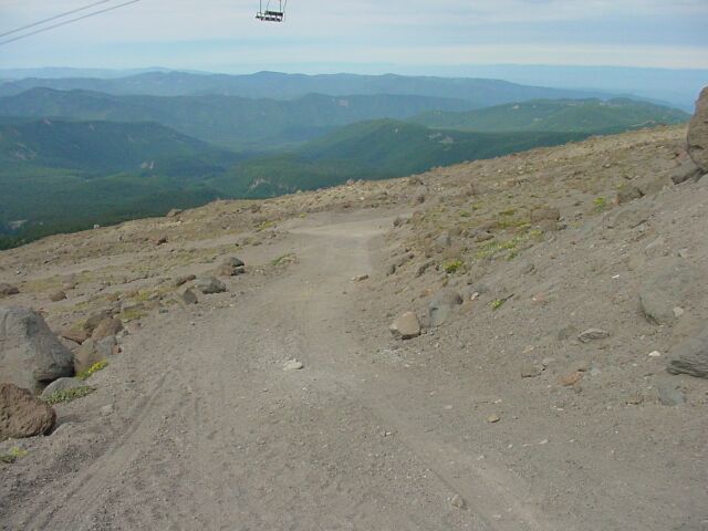 | Looking back up the trail you can see that it is a narrow, and less used path. The crater is growing smaller, and so are the chairlift stations, as we get farther down the mountainside. | |||||||||||||||||