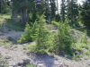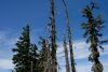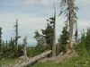 | Looking over the valley, we see forests that are thick and healthy, standing just below where we are. Close up and on the right, there are trees that have green pine needles, but with trunks that look less than healthy. Standing right next to them are ghost trees that have given up on their fight to live at the timberline. |