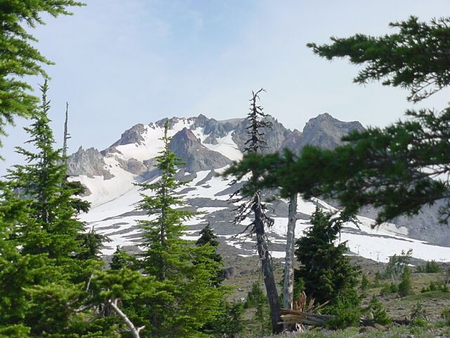 | The Timberline Lodge was build at Mt. Hood's timberline. Our hike took us well above the timberline, but you can see here there are some trees, both living and dead that are still slightly above us. |
