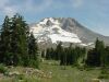 | This was taken from Oregon State Route 26, and you can see that Mt. Hood is getting much closer now. We are still looking at the west face of the mountain, the face that is visible from Portland on a clear day. This face also has its own lava plug, of which the mountain has several, but it is older and more worn from glaciers, therefore less visible than Crater Rock above the Timberline Lodge. |